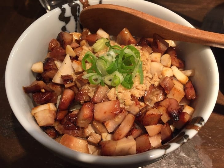 The rice bowl featured chopped, stir-fried chashu different from the ramen version. Topped with minced chicken sauce in the center, it showed the same attention to detail. Superb.